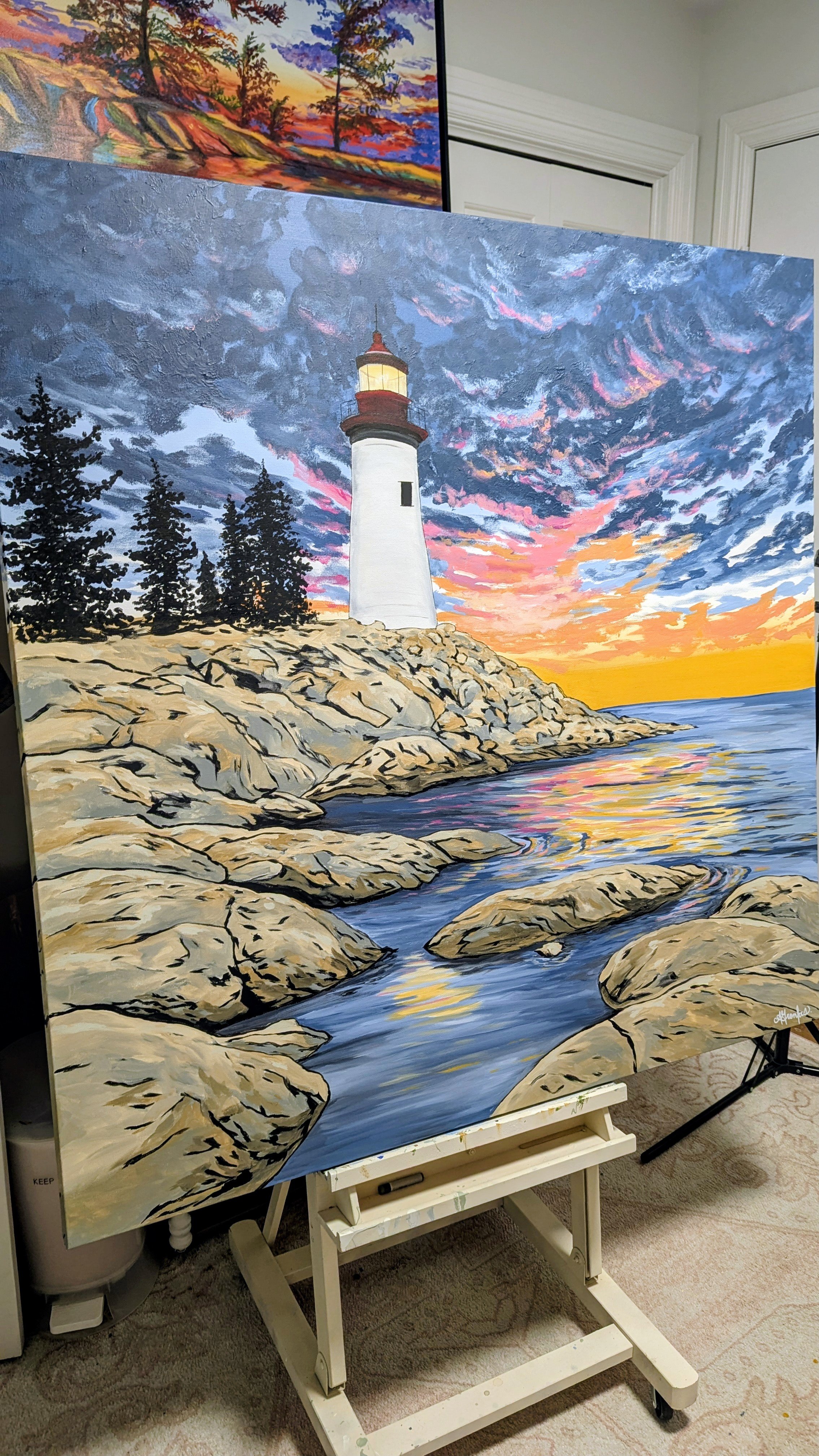 This piece was inspired by that feeling you get at the end of the day, when the light starts to shift and everything slows down just enough to breathe. The lighthouse stands steady above the water, glowing quietly as the sky moves and changes around it. I leaned into bold, expressive brushstrokes in the clouds and rocks, letting the energy of the sky contrast with the calm pull of the water below.